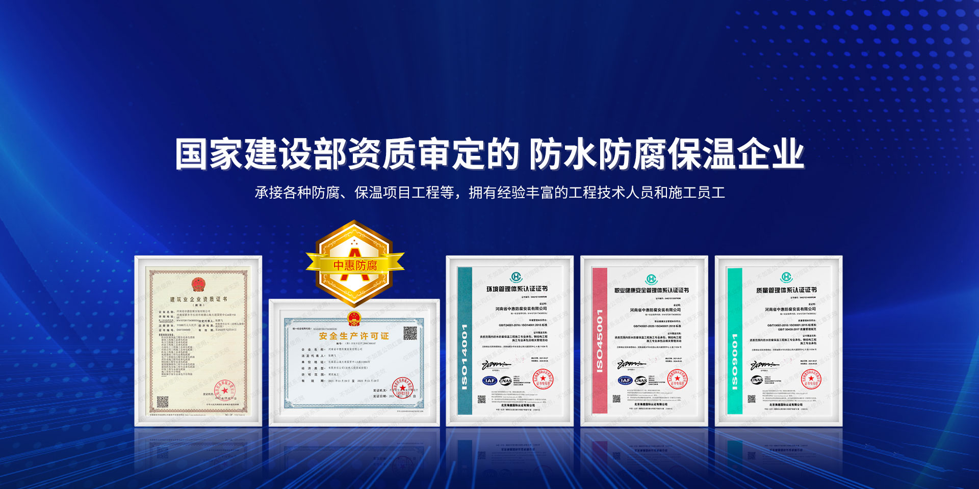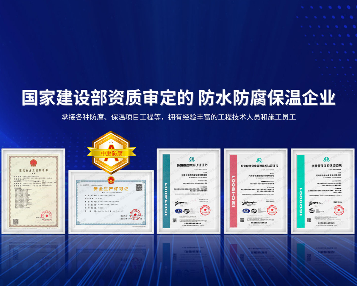公司經營范圍:防水防腐保溫工程;消防設施工程;建筑裝修裝飾工程;建筑機電安裝工程;電力工程;建筑工程;石油化工工程;工業清洗工程;油罐清洗工程;鋼結構工程;環保工程;模板腳手架工程;電纜防火封堵、防污閃噴涂、外墻外保溫工程;各類施工勞務作業;設備維修、船舶鉚焊、涂裝;電力工程材料、建材、防水材料、防火材料、防腐保溫材料銷售,并相繼通過了GB/T19001-2008idtISO9001:2008GB/T50430-2007質量管理體系認證證書。GB/T24001-2004idtISO14001:2004環境管理體系認證證書。GB/T28001-2011idtOHSAS18001:2007職業健康安全管理體系認證證書。公司是中國防腐蝕于防護協會、中國施工企業管理協會、電力協會和中國鋼結構防水協會會員單位。 公司的經營業務涵蓋了石油、化工、電力、冶金、煤炭、船舶、國防、燃氣、水利、環保、交通運輸、航空及國防軍工和輕紡市政等行業的防腐保溫絕熱設備。鋼結構安裝、防火、防水、金屬噴鍍、聚脲噴繪、陰極保護、防滲透堵漏、玻璃鋼及各種磚版材料襯里、橡膠襯里、煙氣硫和耐酸溶劑腐蝕等工程施工。公司連續十年榮獲“省市先進施工企業”“安全生產先進單位”“重合同,守信用企業”和“AA***資質企業”的稱號。2000年被命名為市級文明單位,2002年被國家工商行政管理局命名為“重合同,守信用的企業”、被中國工業防腐蝕技術協會命名為“防腐蝕企業,能源節約及環境保護領域有豐富的經驗和***的業績。工程一次交驗合格率100%。其中攀枝花鋼鐵公司煉鐵廠四號高爐及熱風爐防腐工程、上海寶鋼公司煤氣柜防腐工程、撫順石油一廠裝置防腐項目、齊魯石化公司稀烴廠高塔防腐工程、吉林化學工業公司煉油廠油罐防腐工程、天津石化熱電廠六號爐頂棚聯絡管保溫工程、大慶油田(太倉)力神泵業工程、中國化學工程第十一建設工程、中原油田勘探局工程、中國石化銷售有限公司華北分部、魯皖輸油管道工程、貴州開磷息烽合成氨工程、陜西黃陵煤化工程、中國石油天然氣西部管道塔里木輸油工程、邯鋼集團邯寶鋼鐵公司煉鐵工程、德州供電工程、吉寶(南通)船廠工程,偃師華潤熱力工程、鄭州熱力總公司。 河南省中惠防腐安裝有限公司愿以豐富的施工經驗,***的技術,***的設備,***的管理,***的服務,竭誠為國內外廣大的用戶提供***滿意、******的工程作品。 我公司愿與國內外同仁一道,團結協作,共同推進防腐蝕行業發展! 公司地址:河南省長垣縣建設路北段360號 固定電話:0373-8866488 郵編:453400 網址:http://www_zhff_com_cn.genuoya.com